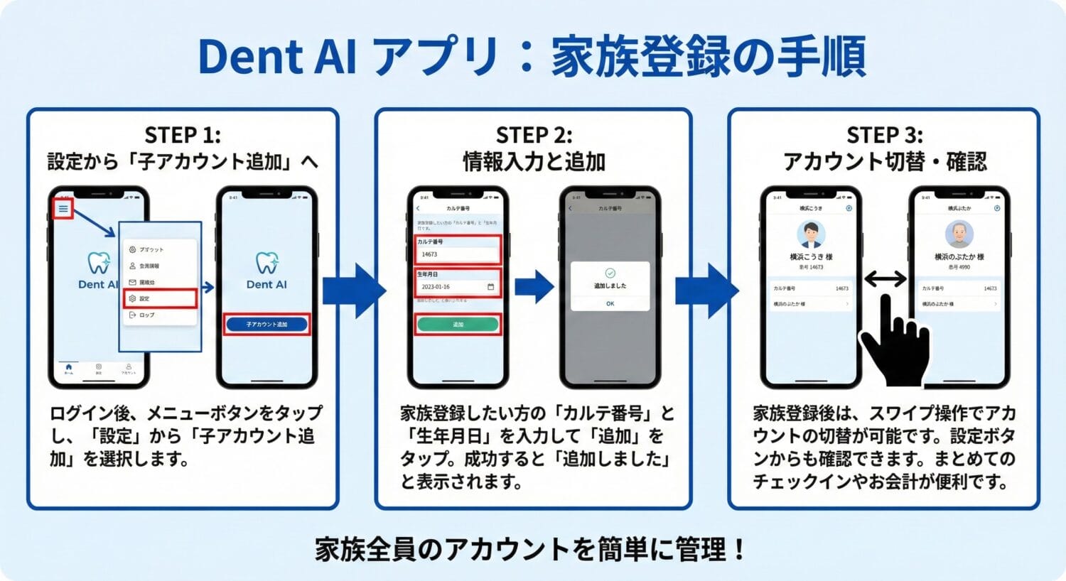 ご家族のアカウントを追加登録すると、まとめてのチェックインやお会計が便利になります。手順は以下の通りです。