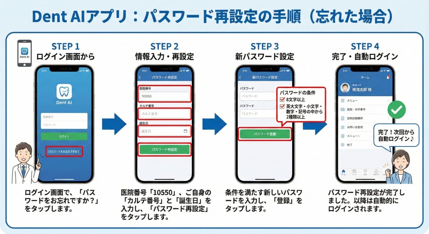 - 新しいパスワードの設定: ご自身で新しいパスワードを設定します。パスワードは以下の2つの条件を満たす必要があります。