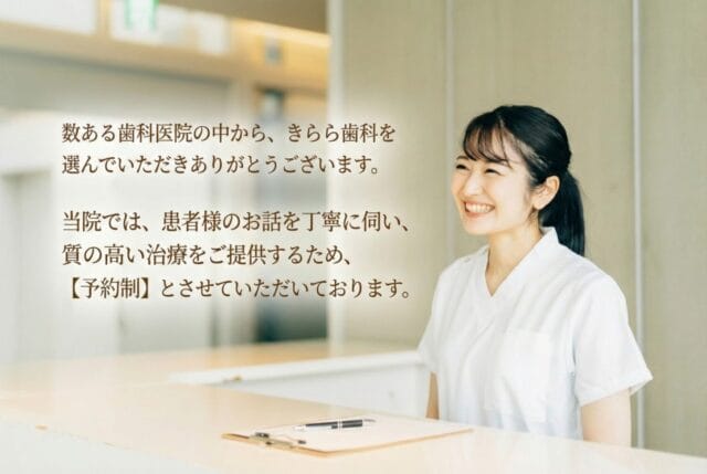 数ある歯科医院の中から、きらら歯科を選んでいただきありがとうございます。 当院では、患者様のお話を丁寧に伺い、質の高い治療をご提供するため、【予約制】とさせていただいております。