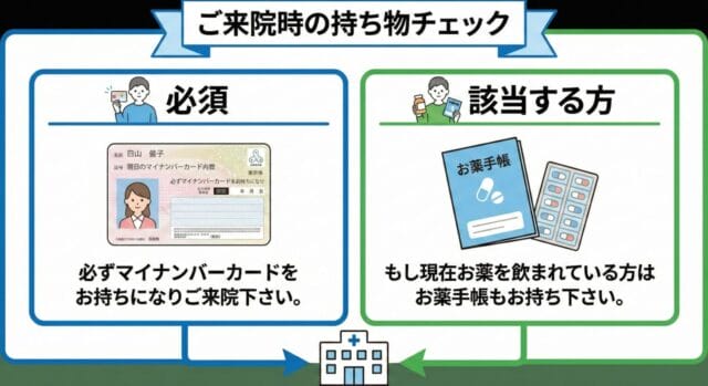 当院はマイナンバーカードによるオンライン資格確認を行っております。 受診の際は、マイナンバーカードおよび各種医療証を必ずご持参ください。 (お薬を服用中の方は、お薬手帳もお持ちください)