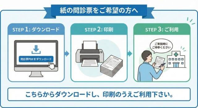 WEB問診が難しい方は、下記より問診票をダウンロードしてご利用いただけます。 印刷・ご記入の上、当日ご持参ください。※印刷ができない場合は、当日院内でご記入いただけますので、予約時間の15分ほど前にお越しください。