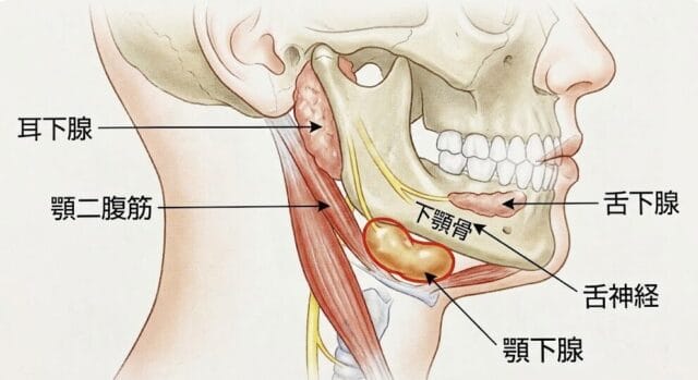 顎下腺とは、顎の下にある大きな唾液腺の一つです。唾液を作り口腔内に分泌することで、食物の消化を助けたり、口腔内を清潔に保つ役割があります。顎下腺に異常が生じると、顎の下や首の側面に腫れやしこりが現れることがあります。