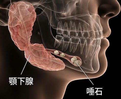 顎下腺内に石(唾石)が形成され、唾液の流れが妨げられることで腫れや痛み、しこりが現れます。食事中に特に痛みが強くなることが特徴的です。