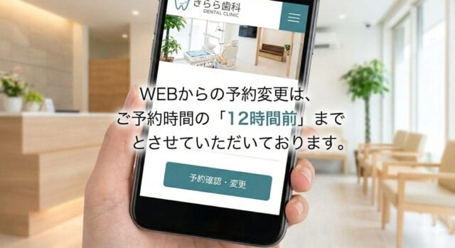 WEBからの予約変更は、ご予約時間の「12時間前」までとさせていただいております。それ以降の変更については、医院までお電話にてご連絡ください。