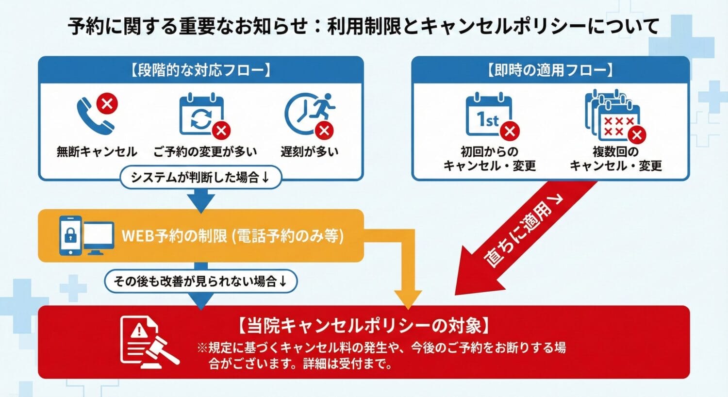 ご予約に関しまして、当院では以下の対応を行っております。「無断キャンセル」「度重なる予約変更」「頻繁な遅刻」等が確認された場合、システムにより自動的にWEB予約のご利用を制限(お電話予約のみへの変更など)させていただくことがございます。