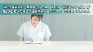 過去1年以内に「無断キャンセル」または「当日キャンセル」が2回以上あった場合、当院キャンセルポリシーの対象となります。