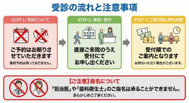 ご予約はお断りさせていただきますが、直接ご来院のうえ受付にてお申し出ください。その際は受付順でのご案内となりますので、お待ちいただく場合がございます。また、「担当医」や「歯科衛生士」のご指名は承ることができませんので、あらかじめご了承ください。
