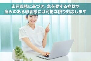 当院では医療機関としての応召義務に基づき、急を要する症状や痛みのある患者様には可能な限り対応しております。ただし、ご予約を頂いている患者様を優先して診療を行っておりますため、当日の混雑状況によっては数時間の待ち時間を頂く場合や応急処置のみの対応となる場合がございます。