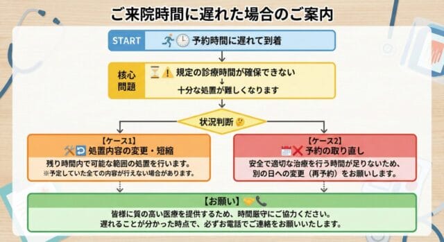 規定の診療時間を確保できないため、処置内容が変更となる場合がございます。また処置内容や遅刻の時間次第では予約の取り直しをお願いしています。