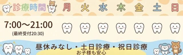 朝7時から夜21時まで年中無休で診療しているため、学校や部活動のあとでも通いやすく、保護者の方からも「家族で通える歯医者」として高い評価をいただいています。