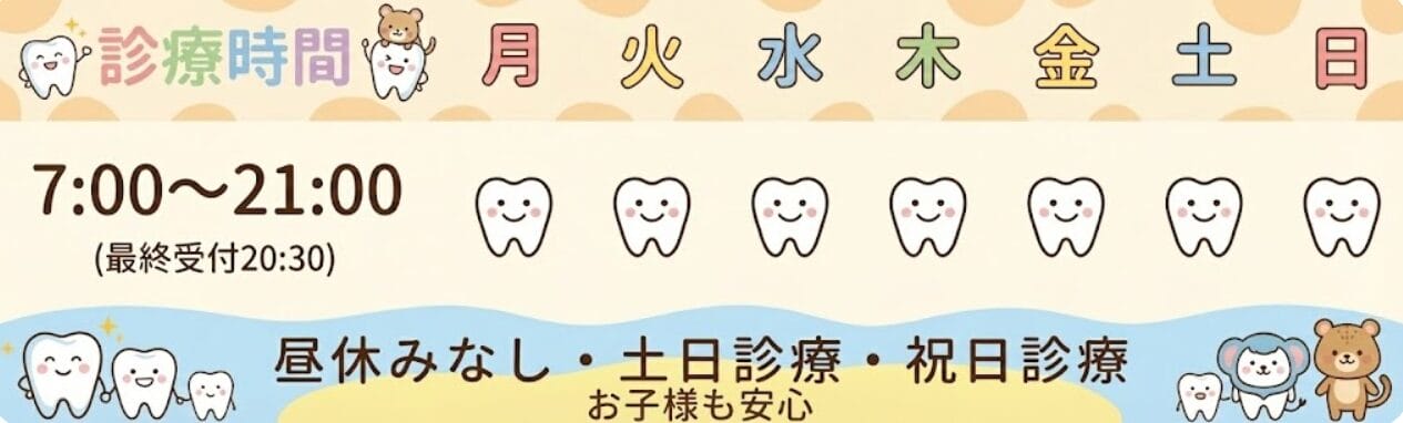 小児歯科・予防歯科・小児矯正を専門に、年中無休で朝7時から夜21時まで診療しています。