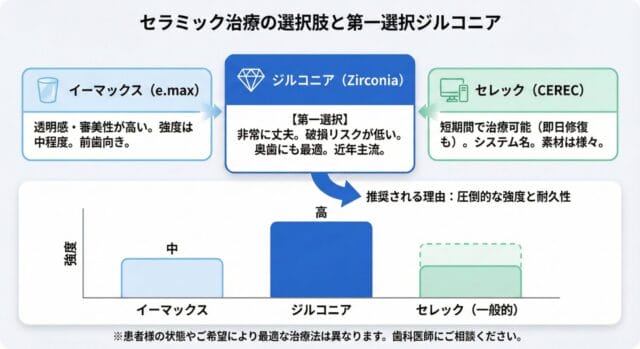 セラミック治療には、大きく分けてジルコニア治療、イーマックス治療、セレック治療があります。ジルコニアは丈夫で破損の恐れが低いため、近年では基本的にジルコニアが第一選択となっています。ジルコニアにはジルコニア(フルジルコニア)とジルコニアセラミック(ジルコボンド)の2種類があります。