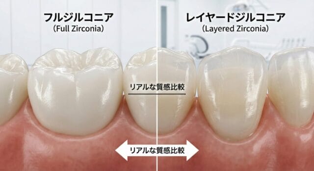 フルジルコニアは削り出し一体型で非常に高い強度を持ち、奥歯や歯ぎしりの強い方に適しています。一方、レイヤードジルコニアはジルコニアフレームにセラミックを築盛した構造で、透明感や自然な色調に優れ、前歯など審美性を重視する部位に向いています。
