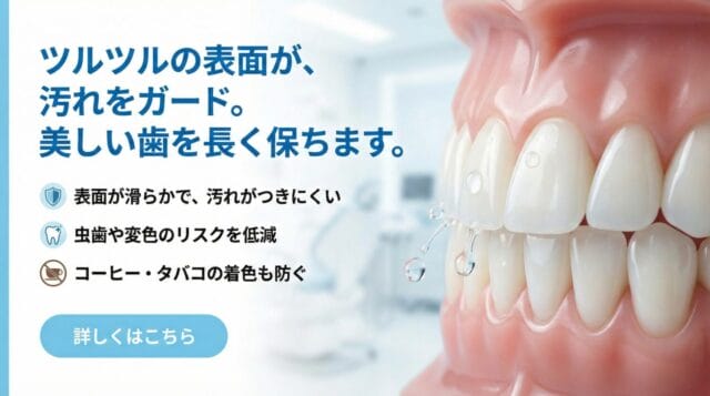 特に、コーヒーや紅茶、ワイン、タバコなどによる着色が気になる方に適しています。また、プラークが付着しにくいため、虫歯や歯周病のリスクも低減できます。