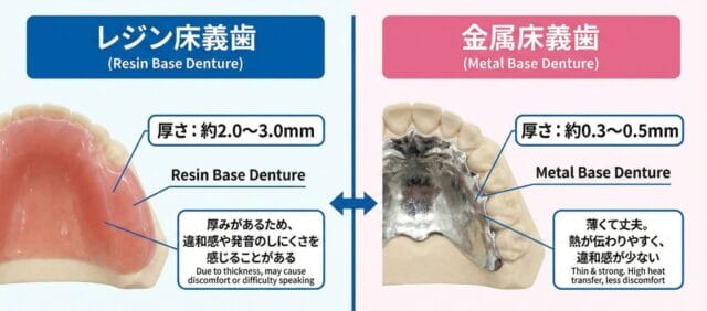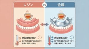 金属床義歯は、レジン床義歯(プラスチック製の義歯)に比べて食事がおいしく感じやすいとされています。その理由は、以下のポイントにあります。
