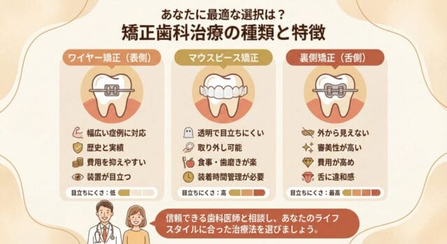 従来の金属ブラケット矯正は目立ちやすいですが、透明なセラミックブラケットや裏側矯正、マウスピース矯正(インビザライン)を選べば、目立たずに治療ができます。見た目が気になる方には審美性の高い矯正方法をおすすめします。