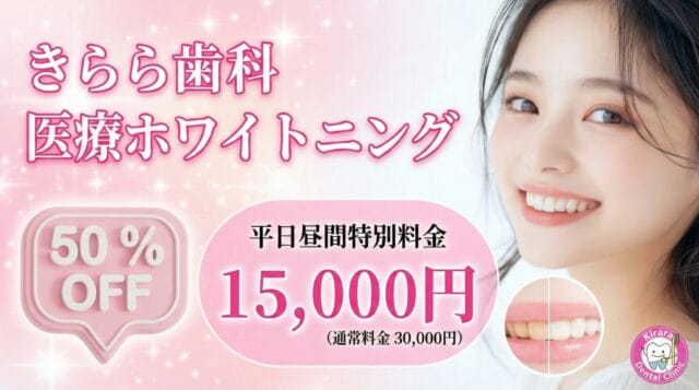 平日昼間は比較的患者数が少なく、治療のご案内がスムーズに行えるため、ホワイトニングを通常よりもお手頃な価格でご提供しています。ゆったりと施術を受けられるうえ、費用面でも大変お得になっておりますので、この機会にぜひご利用ください。